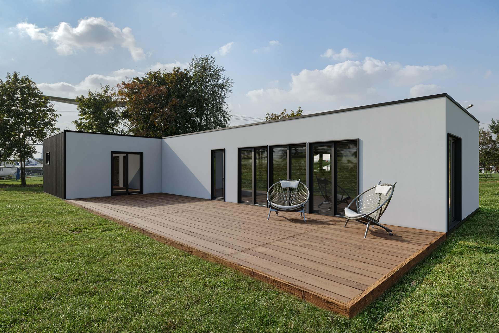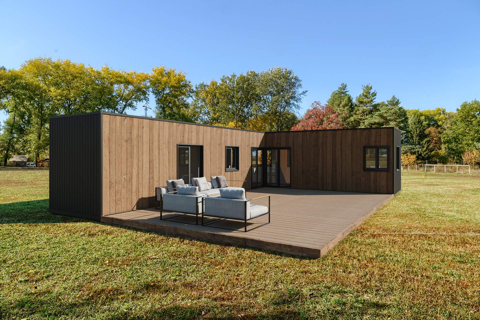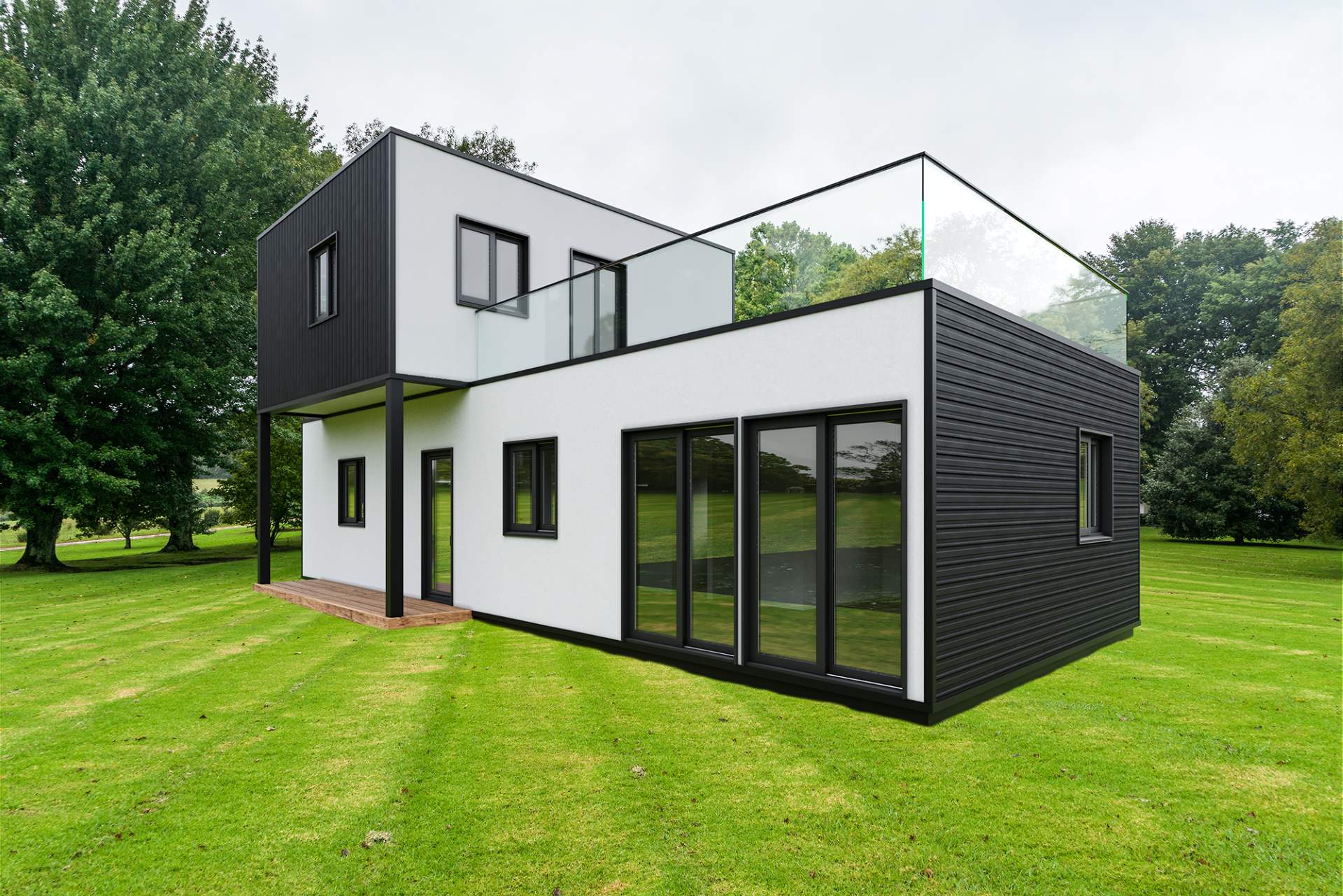 Modelo com todas as características do modelo Basic, incluindo paredes interiores, janelas de tamanho personalizável, casas de banho completas e piso (louças e piso de gama média), instalação elétrica e canalização.
